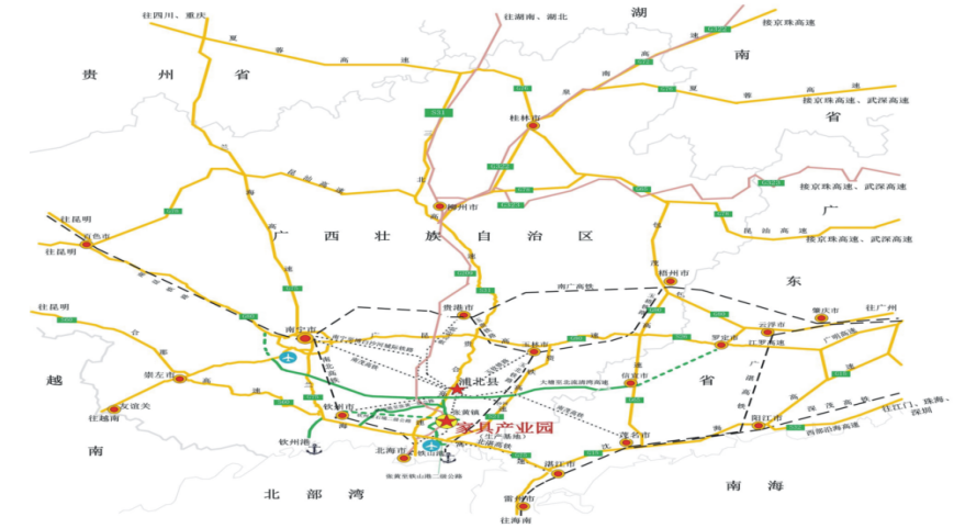 (4)航运,到钦州港约80公里,到北海铁山港约60公里,为产业园家具企业进口木材原料和家具产品销往国内沿海地区及世界各地,提供快速方便通道保障和节省的物流成本。